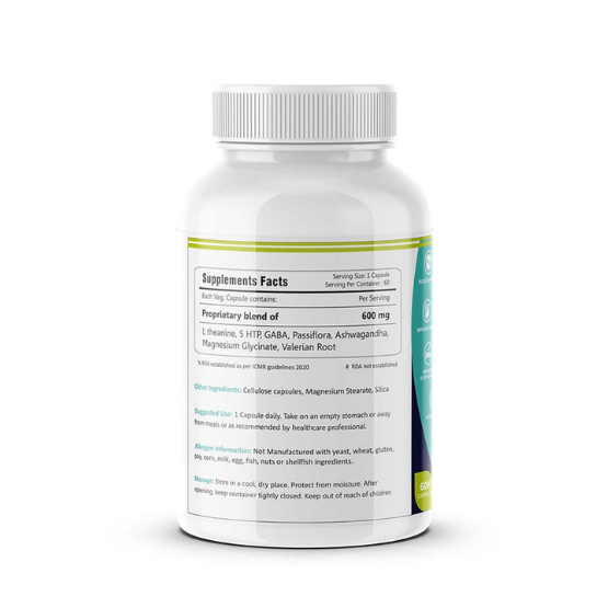 L-Theanine, 5-HTP, GABA, Passionflower, Ashwagandha, Magnesium Glycinate, Valerian Root